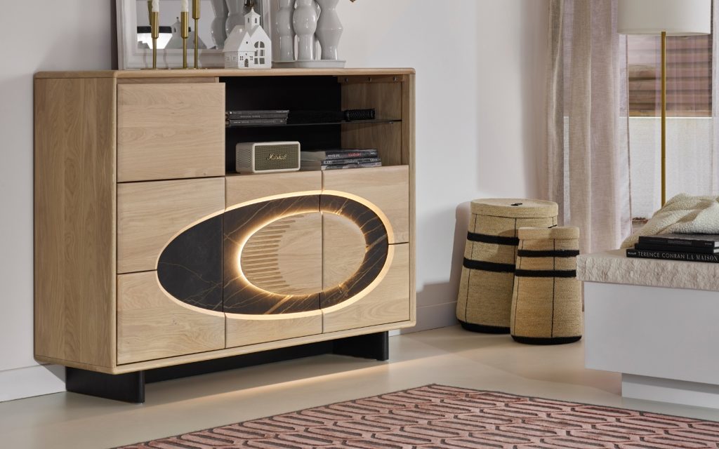 3 portes, 1 cloison entre les 2 portes gauches, 2 tablettes à gauche, 1 à droite – 1 niche avec 1 tablette verre grisé – Dessus, côtés, plancher, séparation : chêne massif – Portes sur charnières invisibles avec amortisseur – Support en médium 13 mm toujours laqué noir mat – Panneaux décors en chêne massif vissés depuis l’arrière des panneaux support – Décors en céramique marbrée maintenus en feuillure dans les décors chêne – Derrière : chêne massif ou abouté 20 mm – Pieds : chêne massif toujours laqués noir mat – Tablette : chêne massif ou abouté laqué noir, réglables en hauteur sur taquets métalliques – Eclairage des portes inclus – Meuble certifié Origine France Garantie.