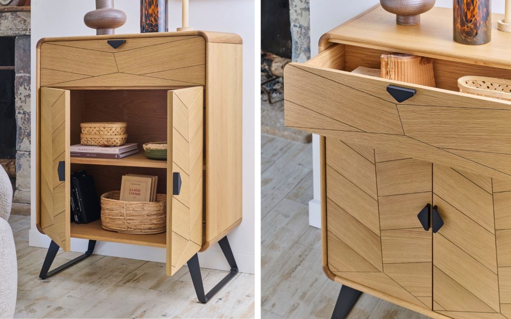 Le chêne clair, délicatement veiné, capte la lumière et se laisse parcourir par la main, adouci par des angles arrondis en chêne massif. Le motif chevron rythme les portes et le tiroir, tandis que derrière les portes, deux compartiments modulables accueillent livres, objets ou souvenirs de voyage. On adore son piètement trapèze en métal noir mat qui apporte légèreté et stabilité à l’ensemble. Un meuble compact qui structure l’espace et y installe une présence sereine.