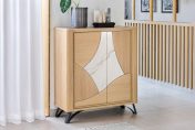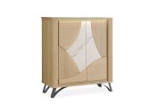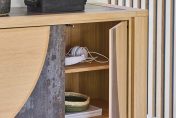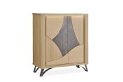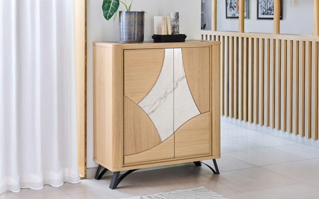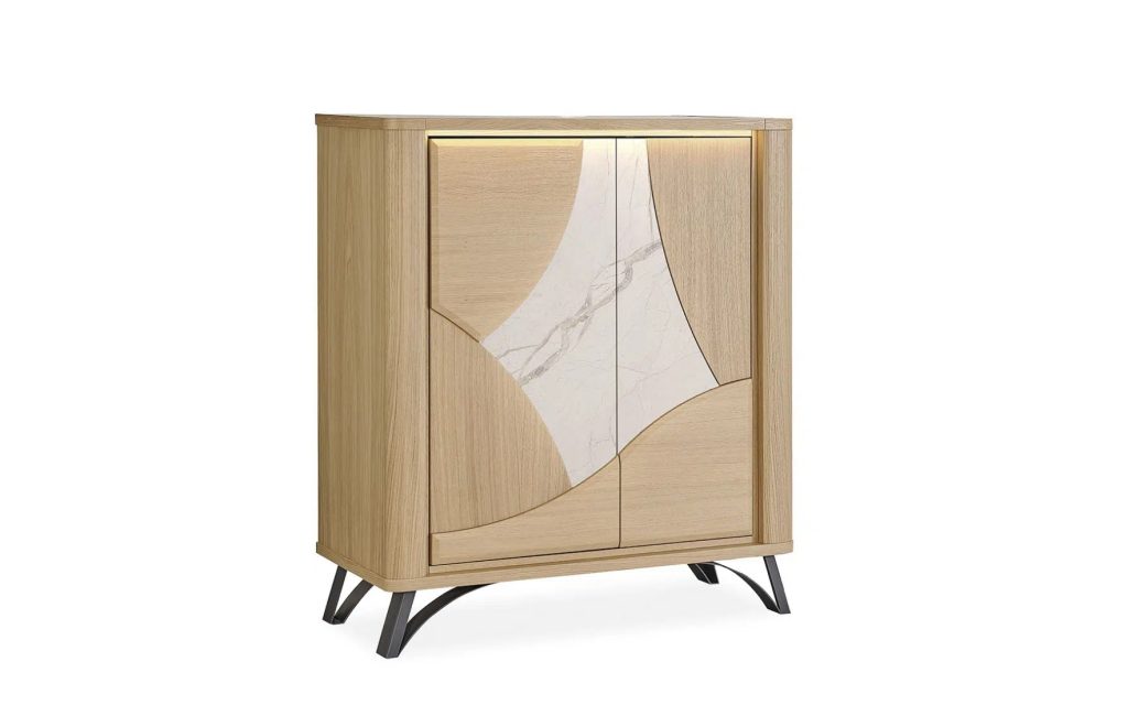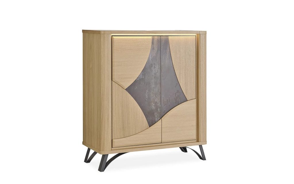 Portes bois : panneaux de fibres moyenne densité revêtus de placage chêne avec incrustation céramique – Dessus : panneaux de particules revêtus de céramique avec emboitures en panneaux de fibres moyenne densité revêtus de placage chêne – 2 finitions de céramique au choix : céramique beige veiné ou DEKTON® brun panaché – Côtés, derrières, fonds et tablettes : panneaux de particules revêtus de placage chêne – Pieds fer finition époxy gris anthracite – Portes : système push – 2 tablettes réglables, 1 tablette fixe – Éclairage LED sous plateau avec interrupteur « touch » – Bois ton brut brossé – Finition teinte acrylique, vernis de finition acrylique.