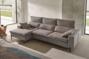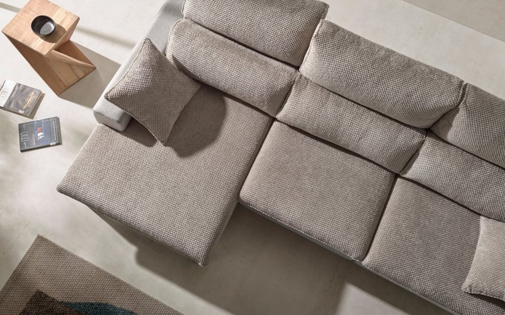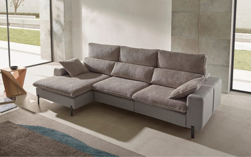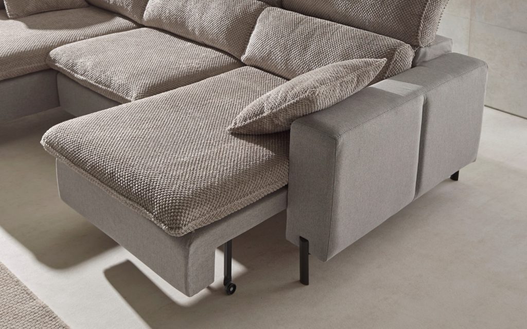 Structure en pin et planche en bois – Assise en mousse polyuréthane Acofoam recouverte de fibre sur sangles élastique 8 cm – Dossier et têtière réglable en fibre creuse siliconée – Piètement en métal marron hauteur 13,5 cm – Assises sur plateau coulissant manuellement avec roues – Profondeur assises coulissées : 191 cm – Coussins d’assise et de dossier déhoussables – Existe en plusieurs dimensions, configurations, tissus et coloris.