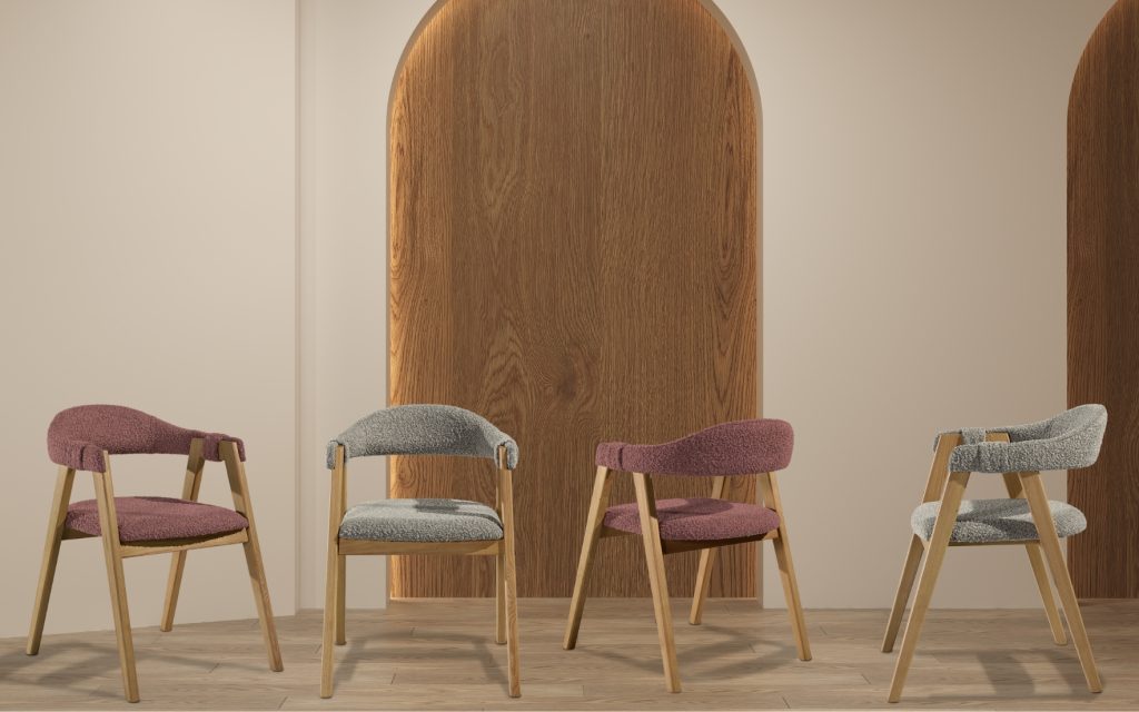 Assise et dossier en tissu Rosello – Tissu bouclé gris Ascot Toffee disponible en supplément – Finition piétement au choix : bois ou métal.