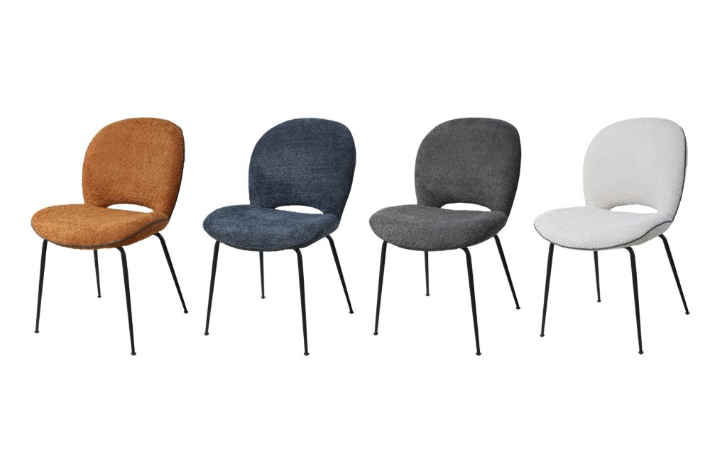Son dossier ajouré dessine une silhouette légère, tandis que son fin piètement noir lui confère ce petit côté « en suspension » qui capte le regard. On adore son tissu bouclé, texturé juste ce qu’il faut pour réveiller la pièce, et son assise généreuse qui offre le confort d’un fauteuil sans occuper plus de place qu’une chaise. Personnalisez votre espace grâce à ses 4 coloris tendance : Caramel pour réchauffer l’ambiance, Azur pour dynamiser, Pierre pour équilibrer, Lune pour illuminer.