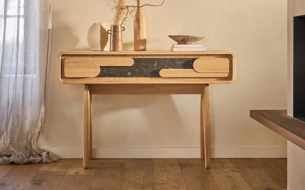 La console ABSOLU séduit par sa silhouette aérienne et ses proportions compactes. Le tiroir, décoré du motif signature en chêne et céramique, accueille vos essentiels tout en révélant la beauté et la profondeur du relief. Sur ses pieds élancés en chêne massif, cette console rayonne de légèreté et de présence. Déclinable en sept finitions de bois et trois variantes de céramique, elle révèle sa personnalité selon vos envies et votre intérieur.