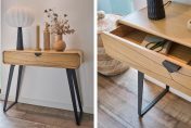 Le chêne clair, délicatement veiné, capte la lumière et se laisse parcourir par la main, tandis que les angles arrondis adoucissent sa silhouette. Le tiroir central, décoré du motif chevron, offre un espace discret pour ranger vos essentiels du quotidien. Les hauts pieds trapèze en métal noir mat apportent légèreté et équilibre, faisant de cette console un meuble à la fois fonctionnel et aérien, idéal pour sublimer un couloir ou un coin salon.
