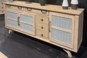 Plateau, côtés, façades en chêne 100% massif – Derrière, caisson bas, séparations et tablettes en panneaux de particules revêtus de véritable bois de placage chêne – Tiroirs en chêne 100% massif montés sur tasseaux bois – Piétement bois avec traverse bois – 2 séparations – 1 grande tablette derrière les deux portes de gauche – 1 tablette derrière la porte imitation tiroirs et la porte de droite – 2 tiroirs (dimensions utiles : L 67,1 x P 41 x H 8,2) – 4 portes battantes, 2 versions disponibles : chêne 100% massif ou cannage – Version cannage : cadre bois chêne massif avec décor cannage plaqué sur panneau de MDF, cannage en rotin, maille de 13 mm, finition laque sur cannage, 29 laques possibles – Existe en version 3 portes 1 tiroir, longueur 175 cm.