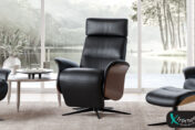 Fauteuil de relaxation avec pivotement à 360° – Appui-tête réglable – Mécanisme d’inclinaison sans effort – Repose-pieds manuel – Structure en acier – Suspension : Dossier et assise sur ressorts en acier offrent un soutien optimal tout en épousant le corps – Coussinage : Mousse polyuréthane souple durcie à froid moulée par injection – Piètement : aluminium moulé laqué Epoxy – Cuir vachette, épais, fleur rectifiée, tannage au chrome – Garantie de 10 ans sur le mécanisme interne. Existe en plusieurs tissus et cuirs, avec accoudoir ou habillage bois et deux coloris de piètement.