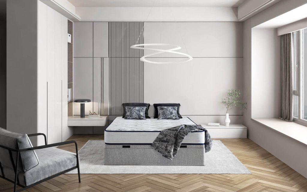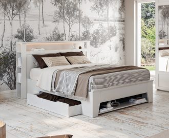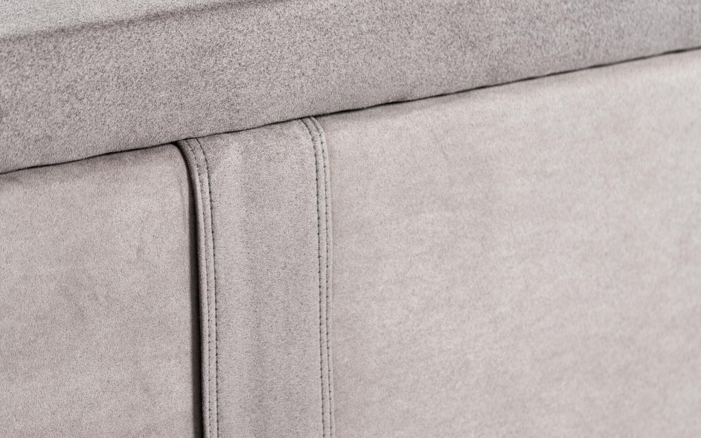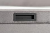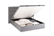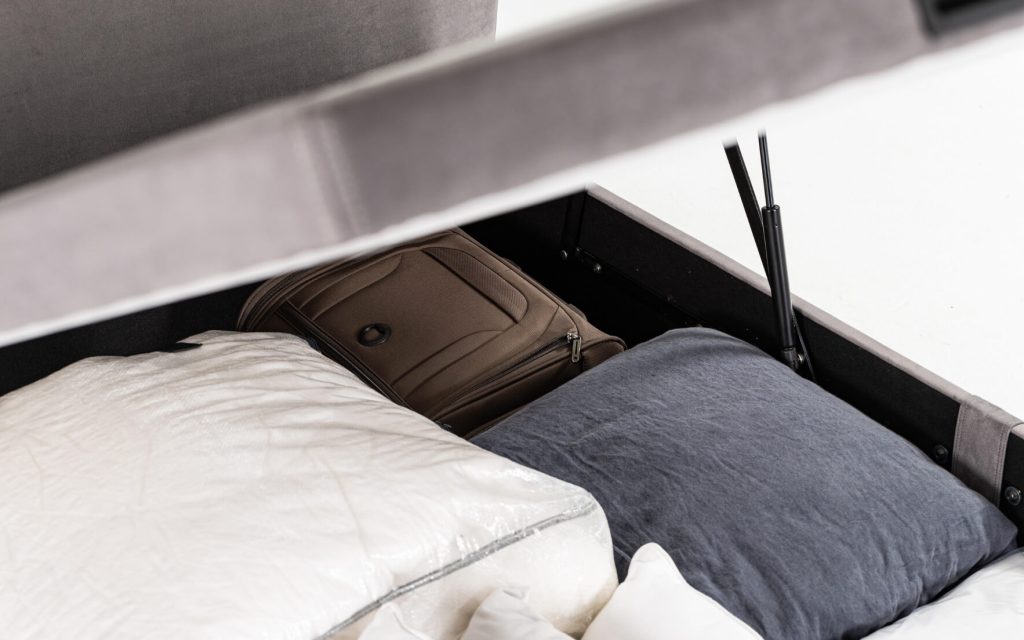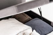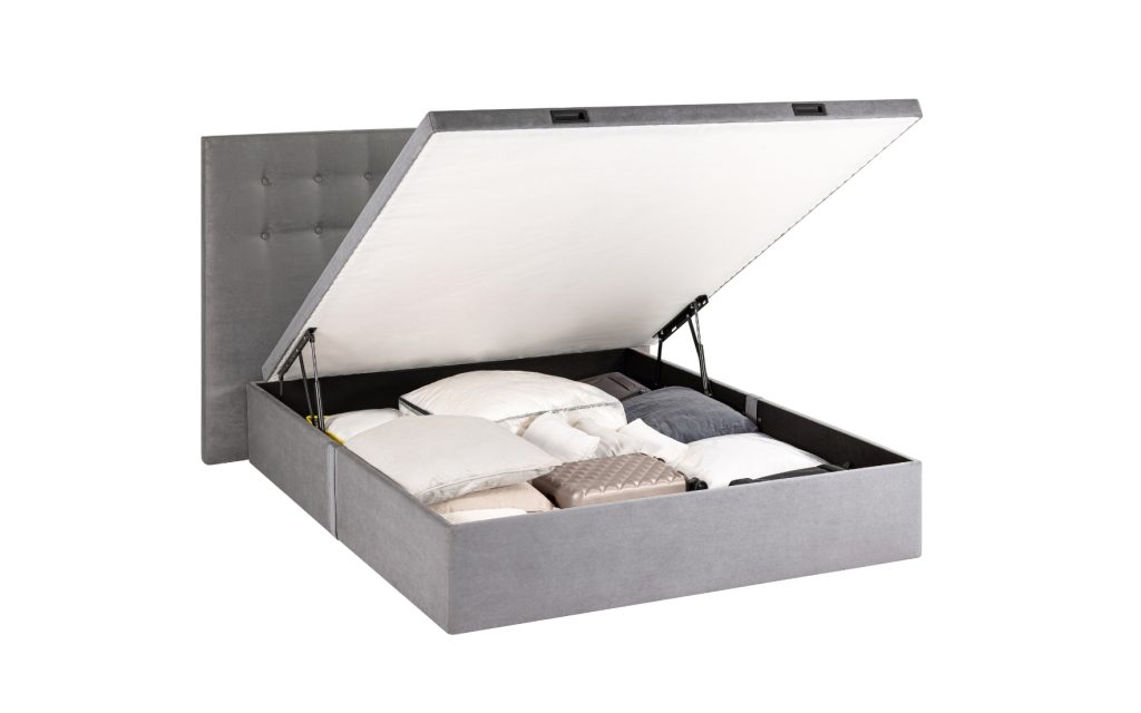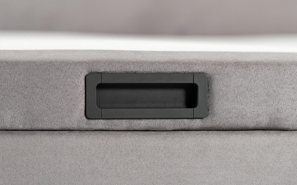 COFFRE : structure en panneaux bois aggloméré, finition tissu déco au choix, espace de rangement optimisé, angles arrondis en façade avec piqûres sellier, 4 aérateurs positionnés, équipé de 9 patins, pied central intérieur pour la dimension 180 cm – SYSTÈME DE RELEVAGE : 2 vérins hydrauliques – SOMMIER MOBILE : structure métallique (30×30 mm) intégrée dans un cadre bois (finition tissu déco), suspension 18 lattes actives par place de couchage insérées dans des embouts polyéthylène d’insonorisation (lattes certifiées FSC), suspension garnie de mousse polyéther recouverte d’une toile anti-dérapante, toile de fond anti-poussière, sommier équipé de 2 poignées encastrées en acier noir mat, arrêt matelas noir (finition tissu déco au choix), angles arrondis en façade avec piqûres sellier – DIMENSIONS et STOCKAGE : disponible en 140×190 cm (700 litres), 160×200 cm (840 litres), 180×200 cm (950 litres) – Hauteur intérieure : 28 cm, hauteur extérieure avec pieds patins : 37 cm – OPTION : plateau double cadres métalliques reliés – Fabrication 100% française.