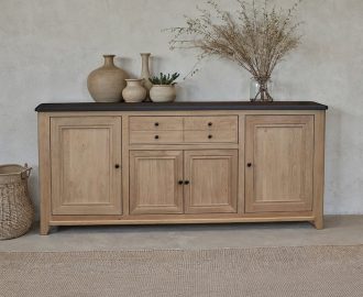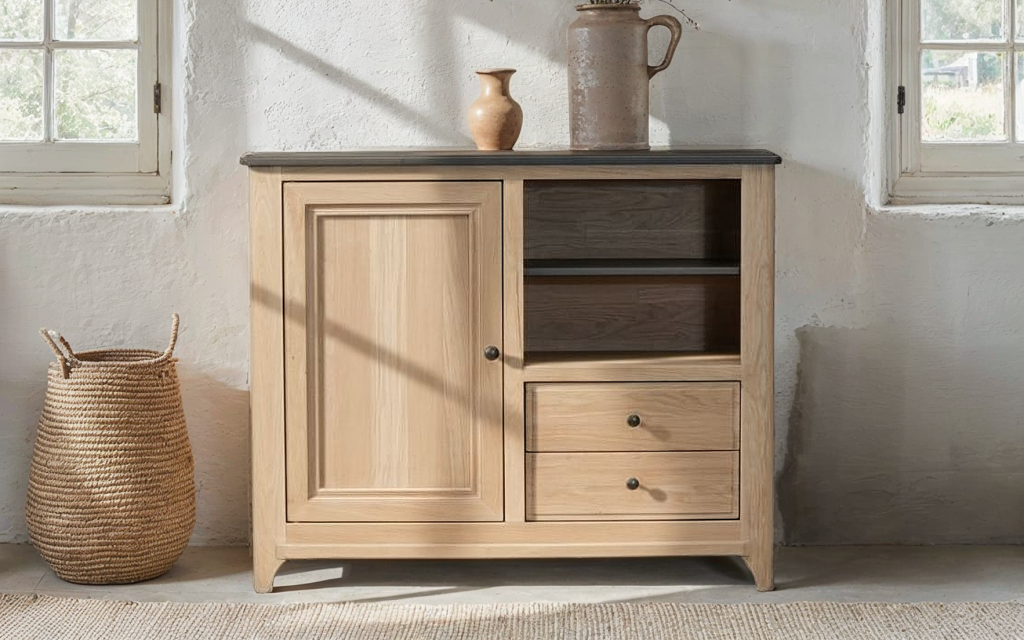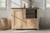 Meuble en chêne qualité rustique : petits nœuds, différences de couleurs, traces d’aubier en intérieur – 1 tablette derrière porte – 1 niche (dimensions L 44 x H 37,5 cm) – 1 tablette, même teinte que le dessus – 1 double prise chargeur USB côté gauche – Dessus, avant, côtés, séparations, tablette niche : chêne massif – Porte : cadre en chêne massif, battante, rotation sur pivots, fermeture par loqueteaux à pince, panneaux de porte chêne massif – Derrière et plancher : chêne massif ou abouté 20 mm – Baguette avant basse et pieds en chêne massif – Tablettes : chêne massif ou abouté laqué noir, réglables en hauteur sur taquets métalliques – Tiroirs : chêne massif, assemblés à queues, coulisses avec amortisseurs et système de réglage en hauteur intégré – Teinte au solvant et vernis PU acrylique au choix pour le corps et le dessus – Meuble certifié Origine France Garantie.