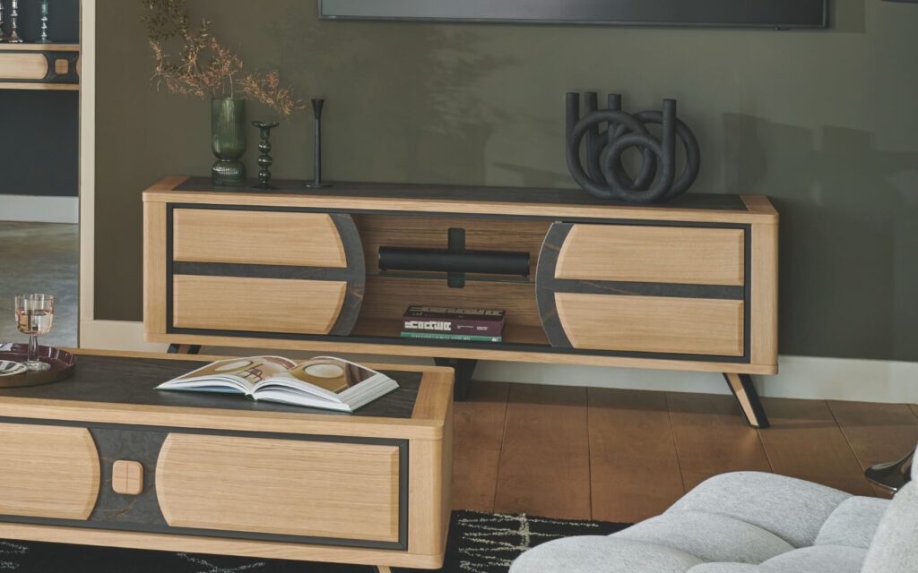 Laissez-vous envoûter par la collection de meubles OMEGA, où le bois et la céramique s’unissent avec audace sous des courbes contemporaines.