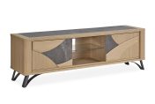 Portes bois : panneaux de fibres moyenne densité revêtus de placage chêne avec incrustation céramique – Plateau : panneaux de particules revêtus de céramique avec emboitures en panneaux de fibres moyenne densité revêtus de placage chêne – 2 finitions de céramique au choix : céramique beige veiné ou DEKTON® brun panaché – Côtés, derrières, séparations et fonds : panneaux de particules revêtus de placage chêne – 1 niche, dimensions L 48,5 x H 34,5 x P 38 cm – Tablette verre réglable dans la niche – Pieds fer finition époxy gris anthracite – Bois ton brut brossé – Finition teinte acrylique, vernis de finition acrylique – Existe également en version 1 porte, longueur 120 cm.