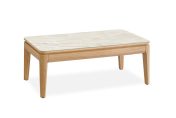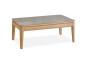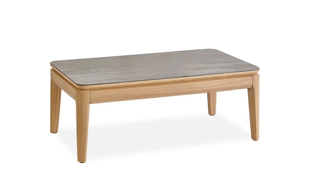 Plateau : panneaux de particules revêtus de céramique – 2 finitions de céramique au choix : céramique beige veiné ou DEKTON® brun panaché – Pieds : tilleul massif plaqué chêne.