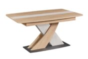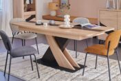Plateaux, allonge et traverses de ceinture : panneaux de particules revêtus de mélamine ton chêne naturel avec nœuds – Décor mélamine imitation céramique sur les plateaux, l’allonge et le piètement – 2 finitions au choix : Iron ou Travertin – 1 allonge centrale « papillon » de 60 cm – Ouverture synchronisée des 2 plateaux – Epaisseur plateaux 25 mm – Coulisses métalliques – Longueur table ouverte avec allonge : 220 cm – Existe aussi en longueur 190 cm (longueur table ouverte avec allonge : 250 cm).