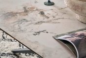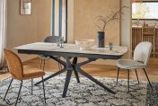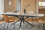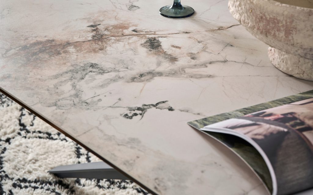 Céramique ép. 3 mm sur verre ép. 8 mm – Finition unique « QUARTZ » – 1 allonge de 80 cm en bout – Coulisse : système cadre en métal sur glissières PVC – Longueur totale table ouverte : 280 cm – Piètement métal finition laque polyuréthane.