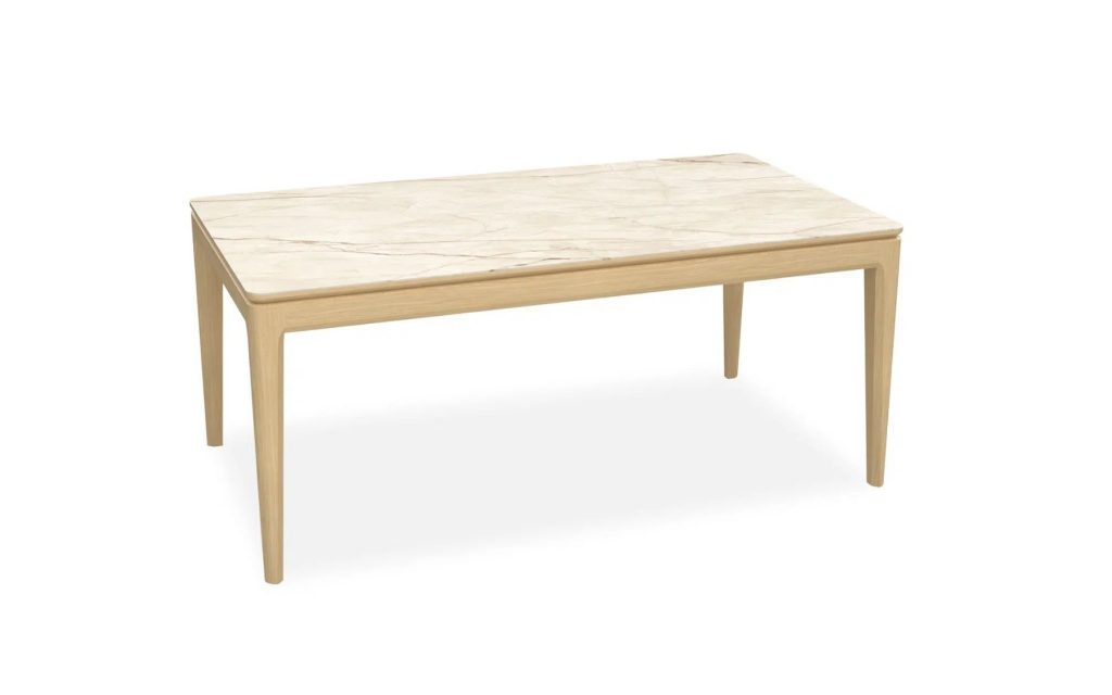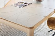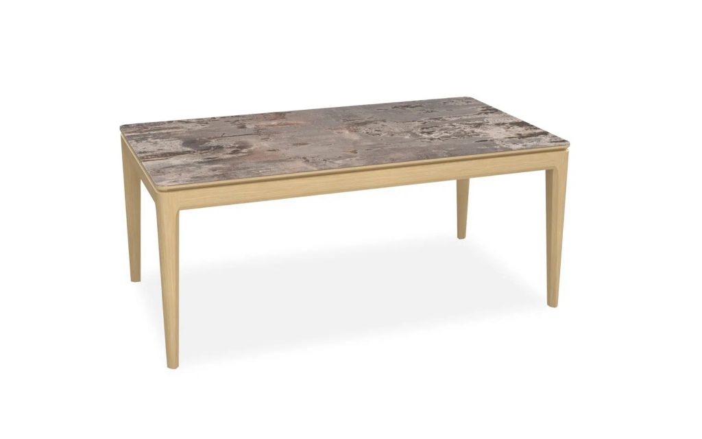 Plateau et allonges : panneaux de particules alaisés revêtus de céramique – 2 finitions de céramique au choix : céramique beige veiné ou DEKTON® brun panaché – Traverses de ceinture : panneaux de fibres moyenne densité revêtus de placage chêne, structure intérieur tilleul massif – Bois ton brut brossé – Finition teinte acrylique, vernis de finition acrylique – Piètement : tilleul massif plaqué chêne – Epaisseur plateau 34 mm – 2 allonges en bout « papillon » de 45 cm (longueur totale table ouverte : 270 cm) – Coulisses métalliques – Existe aussi en longueur 160 cm avec 1 allonge en bout « papillon » de 60 cm (longueur totale table ouverte : 220 cm).