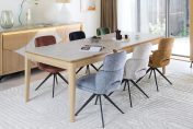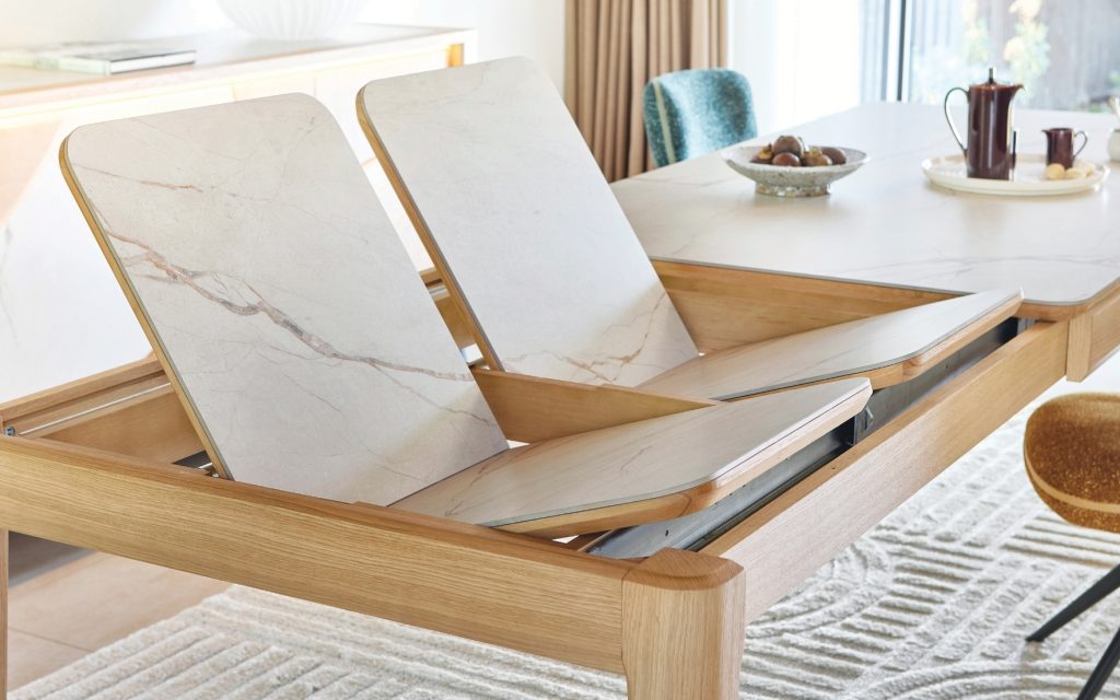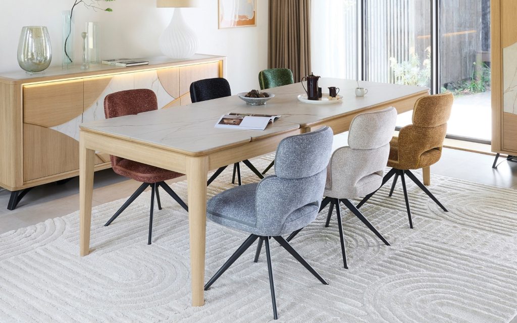 La table de repas extensible RIVIERA transforme chaque repas en moment chaleureux. Grâce à ses deux allonges de 45 cm, elle s’étend jusqu’à 270 cm pour rassembler 10 invités. Sa version plus compacte, avec allonge de 60 cm, s’étire de 160 à 220 cm pour accueillir jusqu’à 8 personnes.