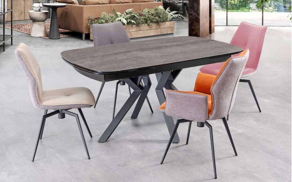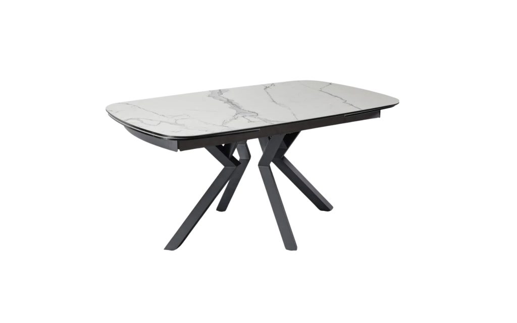 2 allonges en bout escamotables de 40 cm – Plateau céramique ép. 13 mm – Piètement fer finition époxy gris anthracite – Pieds en croix ouvert – Céramique collée sur un verre d’ép. 10mm – 4 coloris disponibles : iron, ton chêne naturel, gris nuancé et blanc marbré – Longueur table ouverte avec 1 allonge : 200 cm – Longueur table ouverte avec 2 allonges : 240 cm – Existe aussi en longueur 190 cm, avec deux allonges de 50 cm.