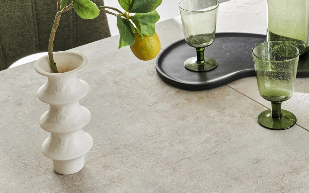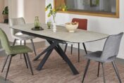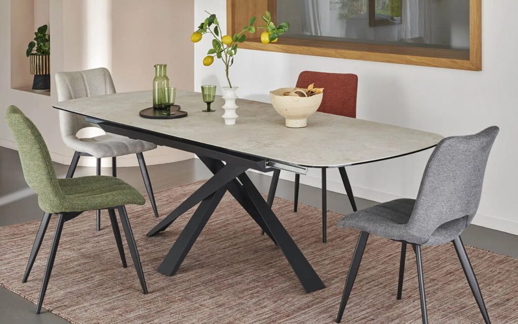 Table tonneau – 1 allonge centrale de 50 cm, système auto-levant rotatif – Longueur table ouverte : 240 cm (10 personnes) – Plateau épaisseur 11 mm : céramique de 3 mm collée sur un verre de 8 mm – 4 finitions de céramique disponibles : ton pierre, gris nuancé, ton chêne naturel et iron – Pieds entremêlés trapèze, fer finition époxy gris anthracite.