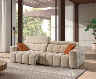 Canapé 3 places en tissu 63% coton et 37% lin – Structure en hêtre et panneaux de particules – Suspension assise sur ressorts nosag et dossier sur sangles – Coussinage assise en mousse polyuréthane 30 Kg/m3 ; dossier en mousse polyuréthane 17 Kg/m3 + ouate – Coussins déco en option