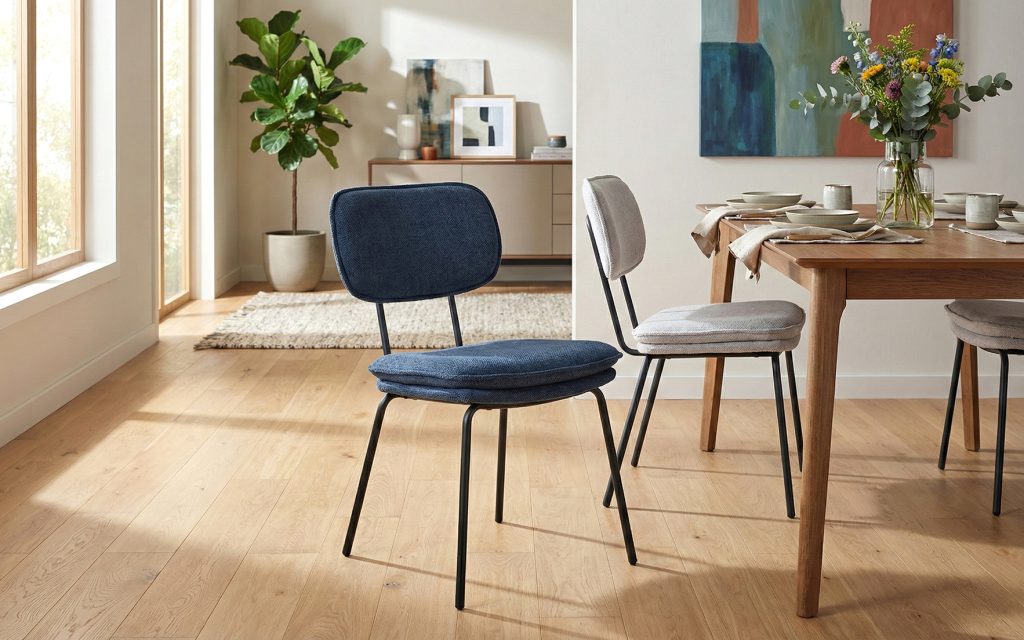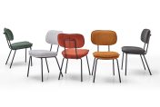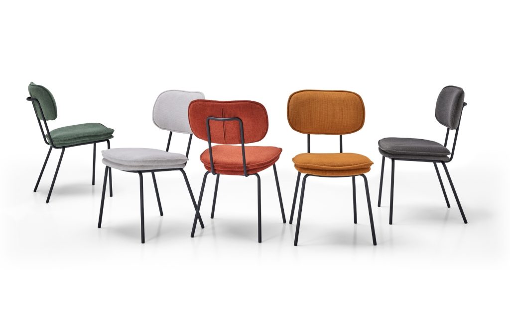 Assise : fixe – Dossier : fixe avec poignée métallique à l’arrière – Composition : mousse polyester (25 kg/m³ pour l’assise, 20 kg/m³ pour le dossier) – Piètement : tube métallique 4 pieds, thermolaquage noir – Disponible en 6 coloris : Saphir, Gris clair, Gris foncé, Terracotta, Safran et Kaki.