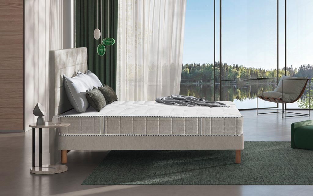 Âme Flow de 16 cm en 100% BULTEX® nano 33 kg/m³ – Hauteur 23 cm – 5 zones morphologiques – 2 faces de couchage : face hiver : 2.5 cm de Bodysoft 23 kg/m³ et fibres hypoallergéniques 250 g/m² ; Face été : mousse de confort 14 kg/m³ et fibres hypoallergéniques 250 g/m² – Coutil Stretch 100% polyester, traitement Phyto-Activ® – Zéro biocide – 4 poignées verticales gansées – Garantie 5 ans – Fabrication Française.