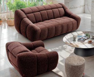 Structure en hêtre et panneaux de particules – Pieds en plastique – Suspensions assise ressorts nosag, dossier sangles – Garnissage polyuréthane assise 30 kg/m³, dossier 25 kg/m³, accoudoirs 20 kg/³ – Disponible en canapé fixe ou relaxation électrique en longueur 202 cm, 192 cm, 172 cm, 144 cm, fauteuil et pouf assorti