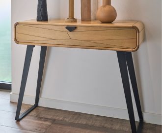 Structure intérieure : chêne ou hêtre massif – Traverses de ceinture : chêne massif – Plateau et allonge : panneaux de particules alaisés revêtus de céramique grise veinée Dekton® – Epaisseur plateau 30mm – Coulisses métalliques – Ouverture synchronisée des 2 plateaux – Allonge centrale « papillon » de 80 cm – Longueur table ouverte avec 1 allonge : 270 cm – Piètement : panneaux de fibres moyenne densité revêtus de placage chêne et acier finition époxy gris anthracite – Finition : teinte acrylique « brut brossé », vernis de finition acrylique – Existe aussi en longueur 160 cm avec 1 allonge de 60 cm, et en 220 cm avec 1 allonge de 80 cm ou 2 allonges de 45 cm.